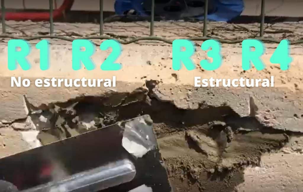 La norma UNE-EN 1504-3 define y clasifica los morteros de reparación en función de sus prestaciones técnicas y usos y define cuatro clases de morteros de reparación: Clase R1 o de menor resistencia, Clase R2, Clase R3 y Clase R4. Cada tipo tiene unos valores diferentes de resistencia a la compresión, adherencia y módulo elástico, entre otros.