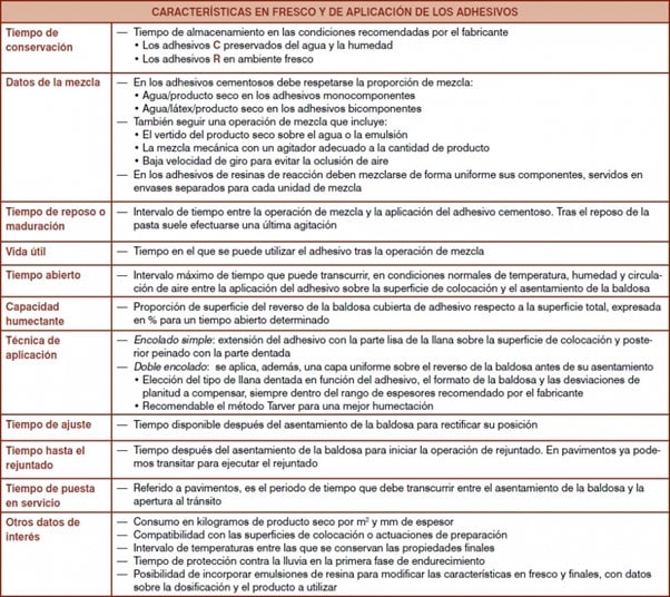 In this table, we show you the fresh and application characteristics of the adhesives with essential elements such as: Shelf life, Mixing data, Resting or maturing time, Shelf life, Open time, Wetting capacity, Application technique, Time until grouting, Time to put into service and other data of interest (Source, Association of Mortar and SATE manufacturers, ANFAPA).